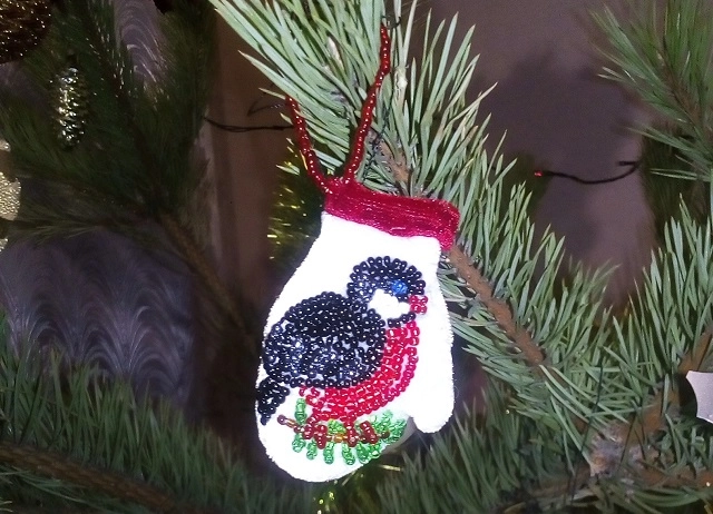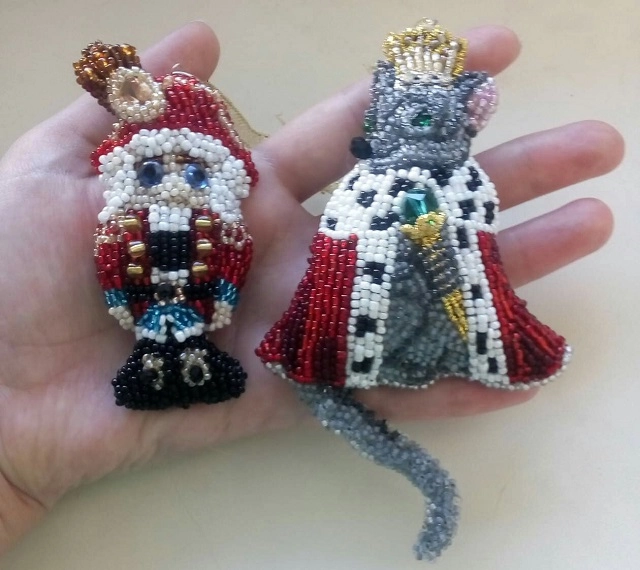 Затем Ксения занялась изготовлением брошей, расшитых бисером, и решила применить освоенную технику для создания ёлочных украшений. Так в её коллекции появились Щелкунчик и Крысиный Король, которых и разглядывать, и трогать приятно. Да и сами брошки иногда приходятся к месту на ёлочке.