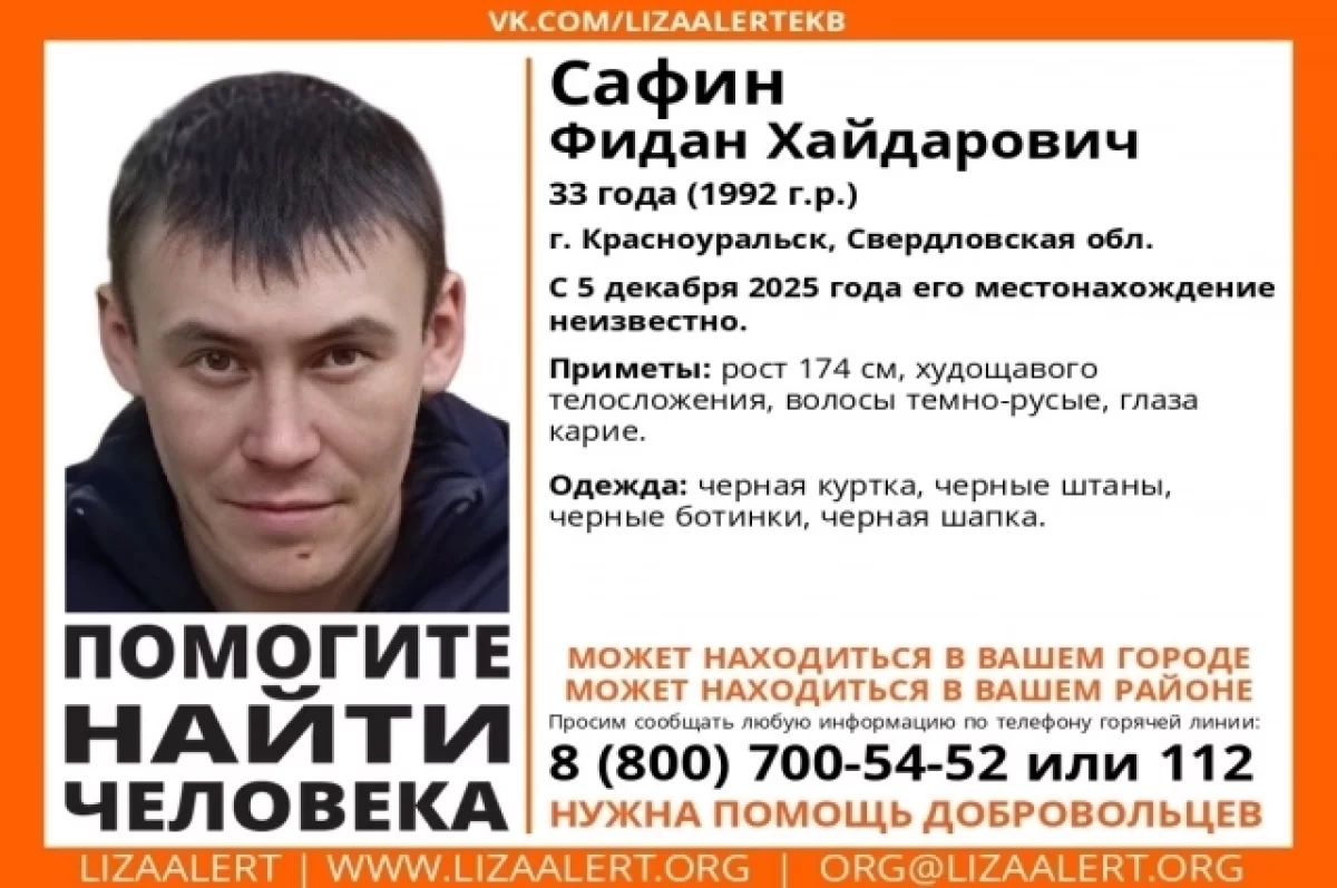 В свердловском городе Красноуральске ищут 33-летнего местного жителя Фидана Сафина. О местонахождении мужчины ничего не известно с 5 декабря, сообщает поисковый отряд «ЛизаАлерт».