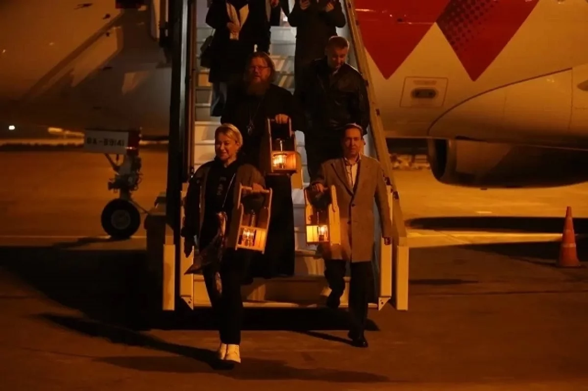 В аэропорту Кольцово миссию встретили десятки священнослужителей и православных верующих со всего Урала. Они приняли Благодатный огонь из рук старшего священника Храма-на-Крови, протоирея Максим Меняйло, директора фонда Александра Андреева и президента Академии спорта РМК Ивана Штыркова, чтобы развезти их по своим приходам.