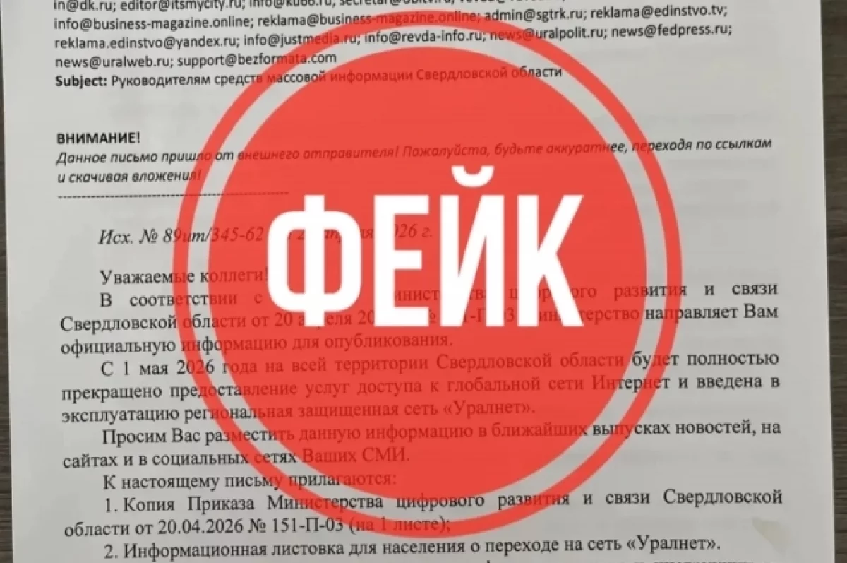 В Свердловской области выявили массовую рассылку вредоносных сообщений, замаскированных под официальные уведомления регионального министерства цифрового развития и связи. Получателям направляют письмо с фальшивым «приказом №151-П-03», в котором говорится о якобы прекращении доступа к интернету и переводе пользователей на вымышленную сеть «Уралнет». Похожие сообщения также распространяют в мессенджерах через поддельный аккаунт ведомства.