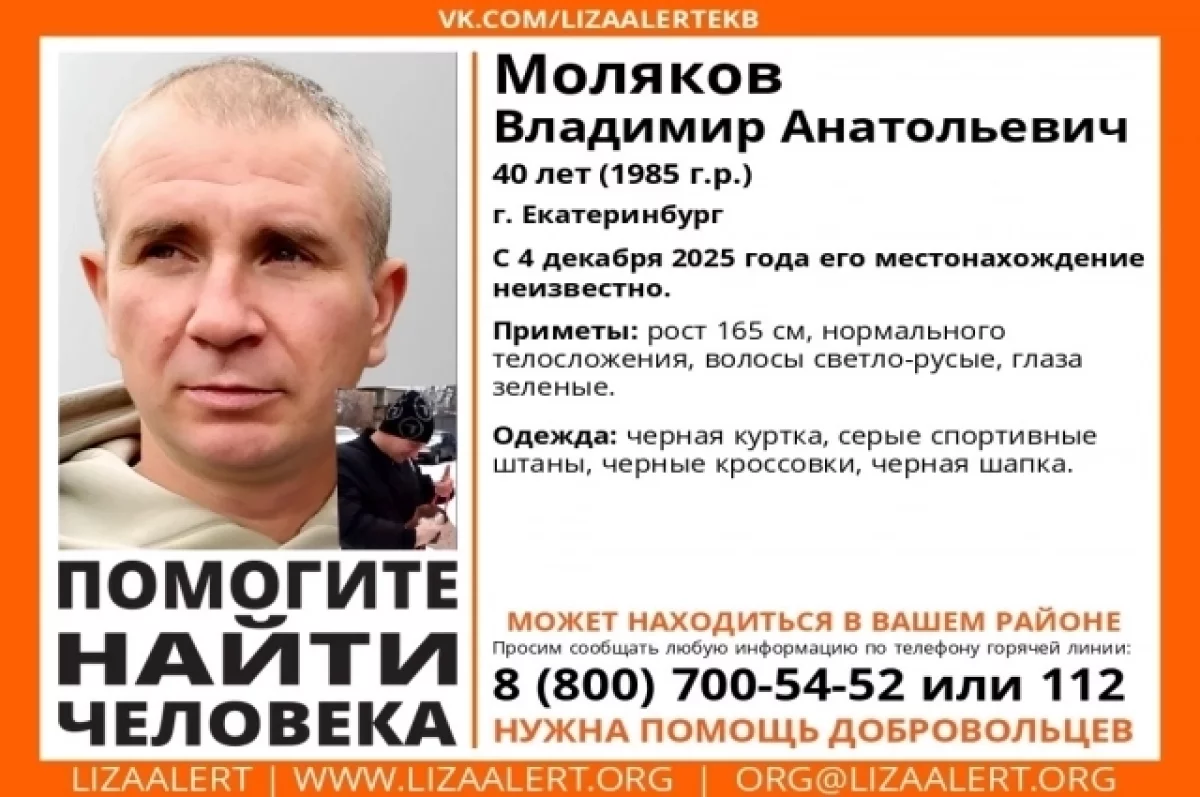 В Екатеринбурге добровольцы поискового отряда «Лиза Алерт» продолжают поиски 40-летнего местного жителя Владимира Молякова. Мужчина пропал еще 4 декабря 2025 года.