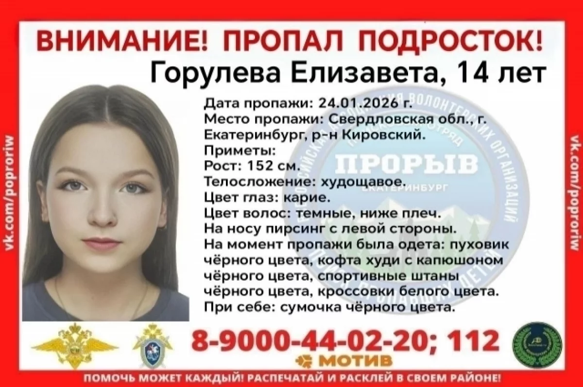 Приметы Елизаветы: рост 152 сантиметра, худощавого телосложения, глаза карие, волосы темные, ниже плеч, на носу пирсинг с левой стороны. Была одета в черные спортивные штаны, кофту худи с капюшоном и пуховик, белые кроссовки. С собой у девочки черная сумочка.