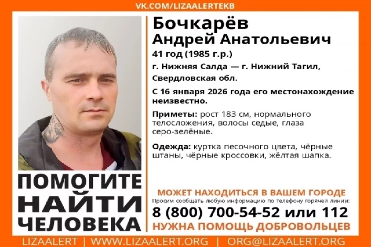 Полиция и волонтеры ищут 41-летнего Андрея Бочкарева, о местонахождении которого ничего не известно с 16 января. Житель Нижней Салды может находиться в Нижнем Тагиле или другом городе Свердловской области.